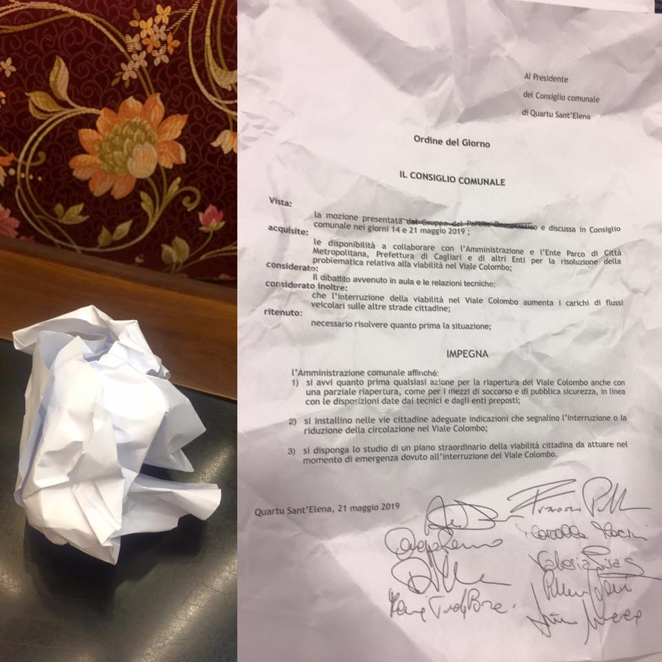 «Nell’Ordine del Giorno – prosegue Piludu – chiediamo che si faccia quanto prima per riaprire, anche parzialmente e sicuramente per i mezzi di soccorso, il Viale Colombo, oltre che monitorare la viabilità e dare indicazioni. Quartu ha bisogno di risposte non di rinvii o deleghe ad altri. Sul gesto antidemocratico di accartocciare i documenti veramente credo che gli organismi preposti faranno le loro valutazioni» ha concluso il consigliere.