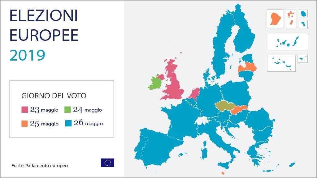 Il voto riguarda tutti i paesi dell’Unione Europea che andranno alle urne da giovedì 23 a domenica 26. I primi a scegliere i propri rappresentati saranno i cittadini dei Paesi Bassi e Regno Unito (giovedì 23) seguiranno gli irlandesi (24 maggio). Sabato 25 si voterà in Lettonia, Malta, Slovacchia, Repubblica Ceca. Domenica al voto in Austria, Belgio, Bulgaria, Cipro, Croazia, Danimarca, Estonia, Finlandia, Francia, Germania, Grecia, Italia, Lituania, Lussemburgo, Polonia, Portogallo, Romania, Slovenia, Spagna, Svezia e Ungheria. Lo spoglio inizierà in tutti i paesi alle ore 23.00 di domenica.