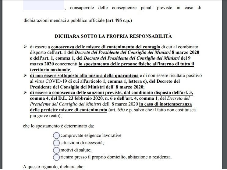 Rispetto al precedente, il nuovo modulo contiene una nuova voce con la quale il cittadino interessato, deve autodichiarare di non trovarsi nella condizione di «divieto assoluto di mobilità dalla propria abitazione o dimora per i soggetti sottoposti alla misura della quarantena ovvero risultati positivi al virus “COVID-19″»