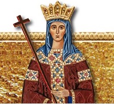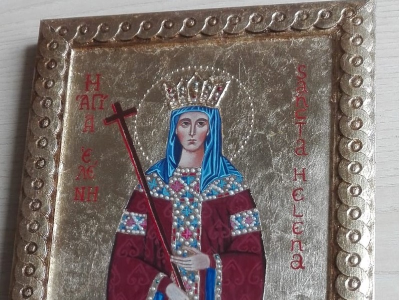 Nella nostra Abbazia è attivo un laboratorio di iconografia, nel quale si esercita l’arte di “scrivere” icone con la tecnica esclusivamente tradizionale: tavola in legno, gessatura con gesso di Bologna e colla di coniglio, pigmenti naturali disciolti con una mistura di uovo e aceto o vino, foglia oro. L’iconografia è l’attività principale dei lavori che svolgo in monastero. L’icona di sant’Elena segna praticamente l’inizio del mio percorso iconografico in Abbazia ed è quindi la prima icona che ho scritto. Quando il nostro maestro di iconografia, mi chiese con quale icona volessi iniziare, non ho avuto alcun dubbio: doveva essere sant’Elena e per diversi motivi. A sant’Elena è consacrata la mia città e la mia parrocchia di origine, nella quale ho ricevuto il battesimo e tutti gli altri sacramenti; qui il mio cammino personale di fede e umano ha avuto dei punti di svolta; qui la comunità intera mi ha voluto da sempre e mi vuole un gran bene e alla notizia del mio percorso vocazionale non ha cessato di sostenermi nella preghiera, cosa alla quale sono molto grato. Inoltre, l’Imperatrice Elena, colei che ritrovò la croce di Cristo, è tra le sante più importanti nell’oriente cristiano e soprattutto nelle chiese di rito bizantino, il 21 Maggio viene ricordata con grandi onori in insieme al suo figlio Costantino.