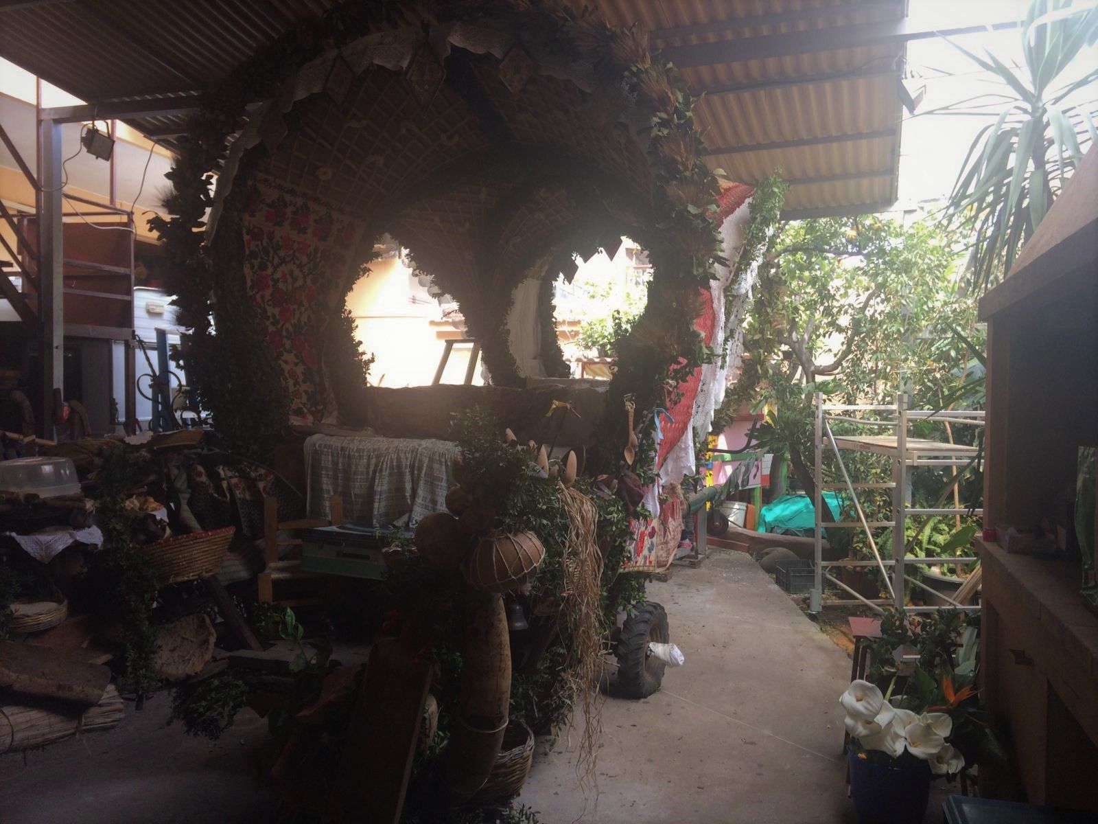 Con gentilezza apre le porte del quartier generale nei pressi di Via Sicilia, dove ogni oggetto sembra stare al suo posto, in un continuo brulicare che trasuda entusiasmo e atavica collaborazione. La prima cosa che salta all’occhio è la presenza di ragazzi e bambini, che per questa occasione come tante piccole api operaie danno man forte agli adulti, rappresentati da una considerevole presenza femminile. Le donne, intente alla preparazione, mettono subito in chiaro che il loro non è un ruolo marginale bensì di prestigio e coordinamento. A troneggiare con grandiosa imponenza è il carro, che ha attorno una folta coltre di collaboratori. Suscita rispetto ma è ancora in potenza: mancano le ruote, quelle verranno montate per ultime. Ricorda vagamente una Ferrari nei gran premi durante i pit stop. Katia e suo padre Luigi tengono a precisare che l’incompiutezza del carro non renda giustizia al suo reale splendore, ma vedendo l’anteprima viene istintivo farsi un’idea. È un tripudio di colori ed orpelli che vanno ad adornare una cornice quasi ricolma di fiori tipici del mediterraneo. Se ne avverte il profumo. Luigi richiama la mia attenzione. Ai lati del carro, tra dolci e prodotti tipici, ce n’è uno in particolare. Sono uova avvolte dentro il pane. Si chiama “angolia”, guai a chiamarlo “coccoi”.